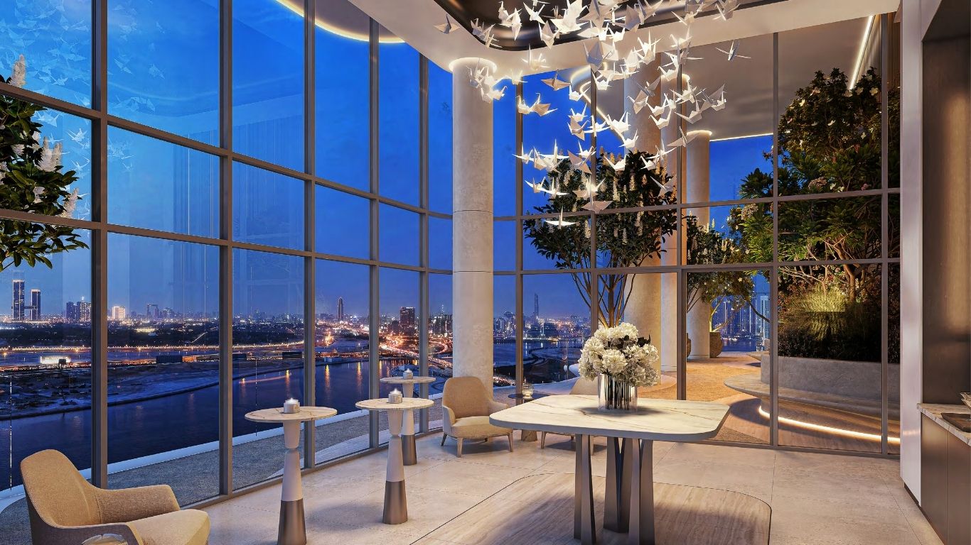 Curated Interiors: Open-plan layouts with floor-to-ceiling windows framing the Dubai skyline and shimmering waters.